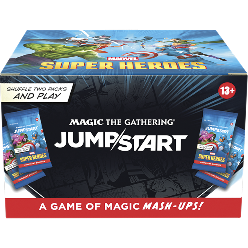 Accessible, fast-play booster display for Magic: The Gathering® featuring the Marvel Super Heroes crossover, built around the Jumpstart “shuffle-and-play” format.